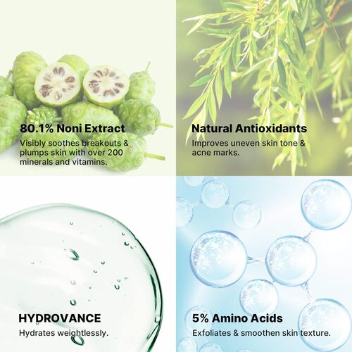 Morinda Citrifolia Fruit Extract (80.1%), Butylene Glycol, Water, 1,2-Hexanediol, Hydroxyethyl Urea, Glycine, Serine, Glutamic Acid, Aspartic Acid, Leucine, Alanine, Lysine, Arginine, Tyrosine, Phenylalanine, Proline, Threonine, Valine, Isoleucine, Histidine, Cysteine, Methionine, Morinda Citrifolia Seed Oil, Rosmarinus Officinalis (Rosemary) Leaf Oil, Melia Azadirachta Leaf Extract, Melia Azadirachta Flower Extract, Theobroma Cacao (Cocoa) Extract, Betaine, Allantoin, Dextrin, Caprylic/Capric Triglyceride, C12-13 Pareth-9, Disodium EDTA, Chlorphenesin